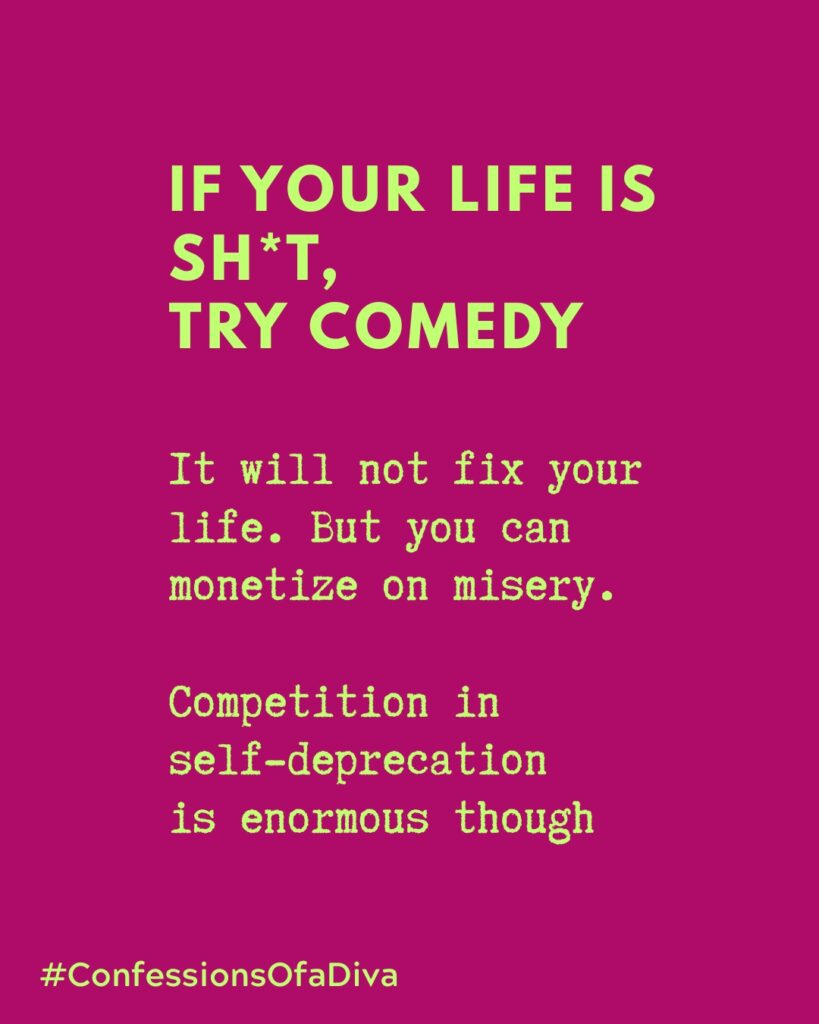 Without further ado, cut to your blond diva taking notes in the comedy bar around the block. The rest is history. Or call it a story I don’t remember.